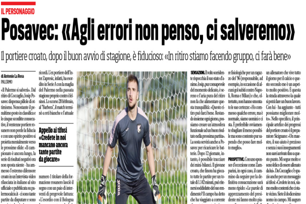 “«Il Palermo si salverà». Dal ritiro di Coccaglio, Josip Posavec dispensa pillole di ottimismo. Nonostante il penultimo posto in classifica e le cinque sconfitte consecutive, il ventenne portiere rosanero non perde la fiducia e con uno spirito positivo si proietta mentalmente verso le prossime sfide: «Il campionato è ancora lungo, la serie di risultati negativi ora non sposta niente – ha ammesso l’estremo difensore croato in un’intervista-video rilasciata in italiano al sito ufficiale e pubblicata su palermocalcio.it – ci sono tante partite da disputare e sono convinto che ci salveremo». La prossima tappa del percorso è la gara esterna con il Bologna, avversario che a titolo personale evoca dolci ricordi. L’ex portiere dell’Inter Zapresic, infatti, ha esordito in Serie A con la maglia del Palermo nella passata stagione proprio contro i felsinei. Lo scorso 28 febbraio, al “Barbera”, il match terminò a reti bianche e l’attuale numero 1 titolare della formazione rosanero lasciò il segno con un paio di interventi di pregevole fattura: «L’esordio con il Bologna fu un momento molto bello. Credo che contro i rossoblù ci siano i margini per disputare un’altra buona partita e vincere». SenSazioni. Il volto sorridente rispecchia il suo stato d’animo. Josip, pur consapevole del momento delicato, è sereno e l’aria pura del ritiro non fa che alimentare questa tranquillità: «Questo ritiro può farci bene. Restando insieme ogni giorno, possiamo creare un’atmosfera funzionale ad un buon risultato nella prossima partita». La sosta servirà anche a Posavec per ricaricare le batterie. Dopo 12 giornate, intanto, è possibile tracciare dei mini-bilanci. Il giovane croato, che finora ha giocato tutte le partite per un totale di 1.142 minuti, può ritenersi soddisfatto del suo rendimento? Il campo ha detto che ha viaggiato a corrente alternata tra prestazioni maiuscole (su tutte quella sfoderata a Bergamo contro l’Atalanta) e prove macchiate da qualche errore. Sbavature fisiologiche per un ragazzo del ’96 (responsabile, ad esempio, in occasione di alcuni gol subiti contro Napoli, Roma e Milan) e che, oltretutto, non hanno smontato le sue certezze: «Ho commesso qualche errore, ma è normale, siamo uomini e ci sta. È preferibile ovviamente sbagliare il meno possibile ma sono contento pur sapendo che posso fare molto meglio».