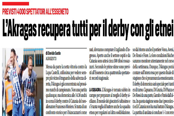 “Messa da parte la netta vittoria contro la Lupa Castelli, utilissima per vedere sempre più vicino il traguardo della salvezza diretta, l’Akragas è già concentrata sul prossimo match di campionato. Non una partita qualunque, ma domenica alle 14.30 andrà in scena il derby contro il Catania del neoallenatore Francesco Moriero. Si tratta di un confronto storico per i biancazzurri come più volte ribadito da dirigenti, allenatore e giocatori al termine del successo nel posticipo del lunedì. In città cresce l’attesa per una partita che promette spettacolo, con in palio punti determinanti per la permanenza in Lega Pro. La prevendita è iniziata con largo anticipo e sarebbero stati già venduti un migliaio di biglietti. Per l’occasione la società agrigentina ha indetto la “giornata biancoazzurra” dove tutti, anche gli abbonati, dovranno comprare il tagliando d’ingresso. Aperto anche il settore ospiti e da Catania sono attesi circa 500 tifosi rossazzurri. Secondo le prime stime sono previsti all’Esseneto circa quattromila spettatori: record stagionale. la squadra. L’Akragas è tornata subito in campo per preparare al meglio il derby siciliano. Il morale dei giocatori è altissimo e c’è tanta voglia di battere anche la squadra etnea per regalarsi un’altra soddisfazione. Anche Pino Rigoli può sorridere, non solo per gli ottimi risultati della sua squadra, che con 7 vittorie in 9 turni è la capolista del girone di ritorno, ma anche per le buone notizie che arrivano dall’infermeria. Il centrocampista bulgaro Dyulgerov, infatti, è tornato ad allenarsi in gruppo e dovrebbe essere del derby, dopo due settimane di stop per infortunio. Pienamente recuperati Capuano e Cazè da Silva, adesso sarebbero ad un passo dal ritorno anche il portiere Vono, Aveni, De Rossi e Fiore. Le loro condizioni fisiche saranno monitore attentamente nel corso della settimana. Dunque, l’Akragas potrà contare sull’intera rosa per questo finale di stagione che si preannuncia emozionante. Il derby di domenica sarà speciale per i tanti ex di turno. Capuano, Di Grazia, Di Piazza e De Rossi da una parte, Garufo e Parisi dall’altra. In questa stagione sono due i precedenti ed il Catania non ha mai battuto l’Akragas. La partita di andata si concluse 1-1 con rete capolavoro dello sloveno Zibert e pareggio dei padroni di casa con Plasmati in extremis. Poi nel primo turno di Coppa Italia di Lega Pro successo casalingo dell’Akragas allenato da Nicola Legrottaglie grazie ad una rete di Leonetti. Il Catania di Pancaro, anch’egli esonerato, sbagliò un rigore nel finale con Russotto. Domenica la terza sfida che sarà diretta dall’arbitro Daniele Viotti di Tivoli”. Questo quanto si legge sull’edizione odierna de “Il Corriere dello Sport”.