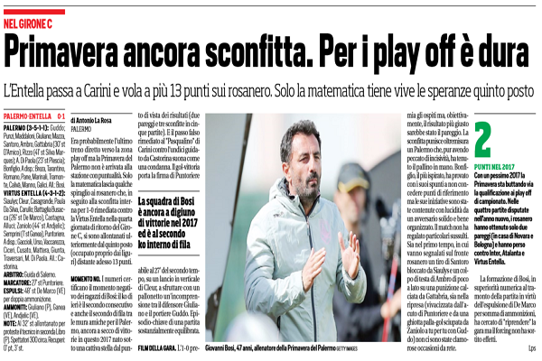 “Era probabilmente l’ultimo treno diretto verso la zona play off ma la Primavera del Palermo non è arrivata alla stazione con puntualità. Solo la matematica lascia qualche spiraglio ai rosanero che, in seguito alla sconfitta interna per 1-0 rimediata contro la Virtus Entella nella quarta giornata di ritorno del Girone C, si sono allontanati ulteriormente dal quinto posto (occupato proprio dai liguri) distante adesso 13 punti. MOMENTO NO. I numeri certificano il momento negativo dei ragazzi di Bosi: il ko di ieri è il secondo consecutivo e anche il secondo di fila tra le mura amiche per il Palermo, ancora a secco di vittorie in questo 2017 nato sotto una cattiva stella dal punto di vista dei risultati (due pareggi e tre sconfitte in cinque partite). E il passo falso rimediato al “Pasqualino” di Carini contro l’undici guidato da Castorina suona come una condanna. Il gol-vittoria porta la firma di Puntoriere abile al 27′ del secondo tempo, su un lancio in verticale di Cleur, a sfruttare con un pallonetto un’incomprensione tra il difensore Giuliano e il portiere Guddo. Episodio-chiave di una partita sostanzialmente equilibrata. FILM DA GARA. L’1-0 premia gli ospiti ma, obiettivamente, il risultato più giusto sarebbe stato il pareggio. La sconfitta punisce oltremisura un Palermo che, pur avendo peccato di incisività, ha tenuto il pallino in mano. Bonfiglio, il più ispirato, ha provato con i suoi spunti a non concedere punti di riferimento ma le sue iniziative sono state contenute con lucidità da un avversario solido e bene organizzato. Il match non ha regalato particolari sussulti. Sia nel primo tempo, in cui vanno segnalati sul fronte rosanero un tiro di Santoro bloccato da Siaulys e un colpo di testa di Ambro di poco a lato su una punizione calciata da Gattabria, sia nella ripresa (vivacizzata dall’acuto di Puntoriere e da una ghiotta palla-gol sciupata da Zaniolo a tu per tu con Guddo) non ci sono state clamorose occasioni da rete”. Questo quanto si legge su “Il Corriere dello Sport”.