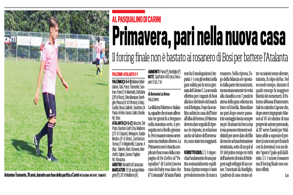 “La sfida tra Palermo e Atalanta, squadre che si sono affrontate tre giorni fa a Bergamo nella massima serie, è proseguita ieri a livello giovanile. Per i rosanero stesso avversario ma risultato diverso. La Primavera non è riuscita a replicare il successo della compagine di De Zerbi e al “Pasqualino” di Carini (nuova casa dei baby rosa dato che il “Comunale” di Santa Flavia non ha l’omologazione) impatta 1-1 con gli orobici nella gara valida per la terza giornata del Girone C. La seconda effettiva per i ragazzi di Bosi alla luce del rinvio del match con il Bologna. Dopo la sconfitta subita in casa dell’Inter all’alba del torneo, il Palermo doveva dare segnali di ripresa e le risposte, in relazione anche al valore dell’avversario, sono state incoraggianti. VERDETTO EQUO. L’1-1 rispecchia l’andamento di una partita sostanzialmente equilibrata: il primo tempo è stato prevalentemente di marca rosanero. Nella ripresa, l’ago della bilancia si è spostato dalla parte dei nerazzurri, momentaneamente in vetta alla classifica con 7 punti in attesa della gara odierna tra Inter ed Entella. Rimediare un pari dopo essere passati in vantaggio lascia sempre un po’ di amaro in bocca ma i rosa possono ritenersi soddisfatti per avere dato del filo da torcere ad una formazione strutturata, sotto di un gol al 10′ del primo tempo in virtù dell’autorete di testa di Melegoni sugli sviluppi di un corner. Trascinati da Bonfiglio, i padroni di casa creano altre occasioni senza sferrare, tuttavia, il colpo del ko. Nel secondo tempo, durante il quale emerge la maggiore fisicità dei nerazzurri, il Palermo abbassa il baricentro. Sale in cattedra Capone che, dopo avere impegnato Marson al 16′ al culmine di una pregevole azione personale, al 20′ serve l’assist per Mallamo abile a superare il portiere (convocato per il match con la Juventus) con un destro “sporco” (palo-gol) dal limite. L’1-1 scuote i rosanero ma il forcing finale non sortisce effetti”. Questo quanto si legge sull’edizione odierna de “Il Corriere dello Sport”.