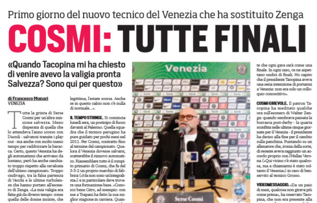 Corriere dello Sport: “Primo giorno del nuovo tecnico del Venezia che ha sostituito Zenga. Cosmi: «Tutte finali»”