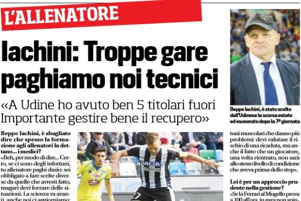 Corriere dello Sport: “Pronto soccorso serie A, Iachini: «Troppe gare paghiamo noi tecnici»”