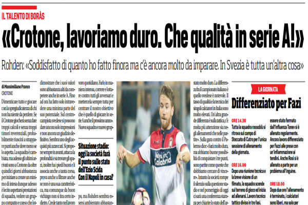 “Dimenticare tutto e giocare con la spregiudicatezza di chi non ha niente da perdere. Se il Crotone giocherà senza fare troppi calcoli e senza troppi timori reverenziali, probabilmente riuscirà a strappare punti anche dove meno se lo aspetta. La squadra è cambiata, ma adesso gli ultimi arrivati sono a Crotone da oltre quindici giorni abbastanza per iniziare a creare un minimo di intesa dunque adesso è lecito aspettarsi prestazioni di squadra, vedere un gruppo compatto e coeso che lotta per raggiungere l’obiettivo comune quello della permanenza in serie A. speranze. Di questo gruppo fa parte Marcus Christer Rohden che vuole vincere la sua personale scommessa e dimostrare che i suoi valori sono abbastanza alti da competere anche in serie A. Fino ad ora ha fatto solo intravedere una minima parte del suo potenziale. Sul centrocampista svedese si possono dare ancora solo impressioni e non ancora un giudizio definitivo. Sembra uno degli acquisti più azzeccati. Si propone sempre in avanti, attacca la profondità e sa trovare gli spazi, inoltre ha i piedi buoni e li associa anche a tanta corsa, prova anche a filtrare anche se non è una sua caratteristica, ma comunque da buon vichingo non si tira certo indietro. Crede tanto nel lavoro Rohden, è convito che dando sempre il massimo in allenamento le cose possono solo migliorare e di conseguenza arriveranno i risultati: «Sono molto contento di quello che fatto, ma la cosa più importate adesso è concentrarsi sul lavoro quotidiano. Farlo in maniera intensa, correre e lottare contro tutti gli avversari e mettercela sempre tutta per centrare il nostro obiettivo che è quello di giocare in serie A anche il prossimo anno». Nuova squadra e nuovo gruppo, ma Rohden sembra essersi ambientato abbastanza bene e dei nuovi arrivi dice: «Supporti di qualità, adesso abbiamo tutti i requisiti per fare bene». Le prime impressioni sul nuovo campionato sono sincere, non è stato semplice per Rohden che confessa: «L’impatto con la serie A è stato molto duro. La differenza fra il campionato italiano è quello svedese è notevole. Il tasso di qualità e la tecnica dei singoli calciatori in Italia sono molto elevati. Un’altra grande differenza è sulla tattica, c’è molta più attenzione sia negli allenamenti che nelle partite». Sulla gara contro il Palermo dice: «Sarà molto dura, ma abbiamo buone possibilità di conquistare i tre punti, sono partite come queste che dobbiamo cercare di vincere». Intanto la società rompe il silenzio sulla questione stadio e nel pomeriggio di oggi ci sarà una conferenza stampa per chiarire lo stato dell’arte dei lavori che competono proprio alla società. Probabilmente oggi si capirà se contro il Napoli il prossimo 23 ottobre il Crotone potrà giocare all’Ezio Scida.”. Questo quanto si legge sull’edizione odierna de “Il Corriere dello Sport”.
