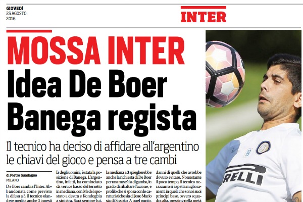 “De Boer cambia l’Inter. Abbandonata come previsto la difesa a 3, il tecnico olandese medita anche 3 innesti nell’undici titolare: Perisic, Murillo e, a sorpresa, Santon. Con un punto fermo, però, vale a dire l’elemento destinato a diventare il faro della squadra. E’ a Banega, infatti, che l’allenatore nerazzurro ha deciso di affidare le chiavi del gioco. Una scelta presa subito, appena sbarcato alla Pinetina, e senza alcun tipo di incertezza. Probabilmente non sarebbe stato così per Mancini, che non aveva indicato l’argentino, che anzi riteneva una delle cause del mancato arrivo di Yaya Tourè. REGISTA. Ieri, dopo il giorno di riposo, alla Pinetina sono cominciate le prove tattiche in vista di Palermo. Modulo adottato, il 4-3-3 che è anche il marchio di fabbrica del tecnico olandese. La novità, al di là degli uomini, è stata la posizione di Banega. L’argentino, infatti, ha cominciato da vertice basso del terzetto in mediana, con Medel spostato a destra e Kondogbia a sinistra. Sarà sempre lui, insomma, il primo destinatario del passaggio in uscita dai difensori. Potrà/dovrà abbassarsi per ricevere il pallone, e poi smistarlo. Piena libertà anche di avanzare, con l’accorgimento che il tandem Medel-Kondogbia si abbassi per guardargli le spalle. In tal caso, dal 4-3-3 si passerebbe ad una sorta di 4-2-1- 3, che era poi l’evoluzione tattica adottata anche all’Ajax. INTERNI. Banega al centro della mediana a 3 spiegherebbe anche la richiesta di De Boer per una mezz’ala di gamba, in grado di ribaltare l’azione, e profilo che si sposa con le caratteristiche sia di Joao Mario sia di Sissoko. A quel punto, con Banega al centro, sarebbero in tre ruotare per due maglie: i soliti Medel e Kondogbia, più il nuovo acquisto. Attenzione, però, perché, se alla fine dovesse restare, toccherebbe a Brozovic alternarsi ai primi due. Il croato piace a De Boer, ma certi rapporti interni ed esterni, oltre che necessità di lista Uefa, rendono preferibile una sua cessione. Senza offerte adeguate, tuttavia, l’ex-Dinamo Zagabria resterà e avrà spazio. PRINCIPI. In ogni caso, quella che si vedrà domenica sera con il Palermo sarà un’Inter più vicina alle idee di De Boer, idee che erano state messe da parte al Bentegodi per il timore di pagare dal punto di vista atletico. Tale scelta, però, ha prodotto più danni di quelli che avrebbe dovuto evitare. Nonostante il poco tempo, il tecnico nerazzurro si aspetta miglioramenti in quelli che sono i suoi principi base, ovvero squadra alta, pressing nella metà campo offensiva e attacco ai portatori di palla avversari, anche a costo di rischiare l’uno contro uno. SORPRESA SANTON. Intanto, come premesso, Murillo e Perisic si riprenderanno un posto da titolare. Il primo era squalificato e la sostituzione con Ranocchia era stata obbligata. La panchina del secondo, invece, aveva destato sorpresa. Poi De Boer l’ha spiegata con il fiato corto e la poca abitudine a coprire l’intera fascia del croato. Ora gli farà posto uno tra Candreva ed Eder. In difesa, invece, dopo tre trasferimenti mancati (Sunderland, Napoli e West Ham) è rispuntato Santon, ieri provato a sinistra e Nagatomo a destra.”. Questo quanto si legge sull’edizione odierna de “Il Corriere dello Sport”.