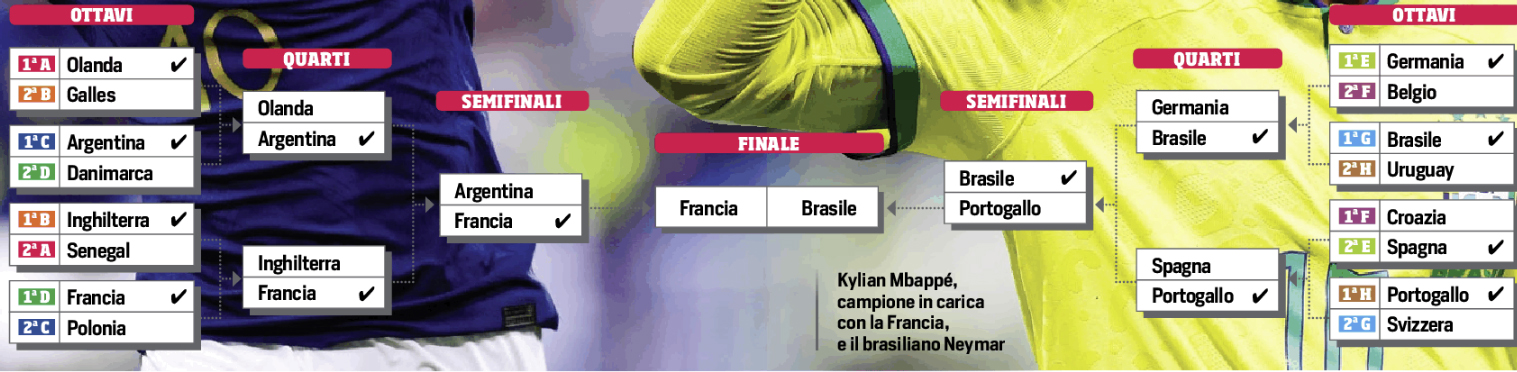 La logica e la composizione della griglia suggeriscono una finale eurosudamericana. Francia-Brasile il 18 dicembre in Qatar, Mbappé contro Neymar e Marquinhos in stile Psg, Rabiot contro Danilo, Bremer ed Alex Sandro in stile Juve, e possiamo continuare con Benzema, Tchouameni e Camavinga contro Militao, Vinicius e Rodrygo per il Real Madrid, Konaté contro Alisson e Fabinho per il Liverpool, Lloris contro Richarlison per il Tottenham, Varane contro Casemiro, Fred e Antony per il Manchester United, Saliba contro Gabriel Jesus e Martinelli per l’Arsenal, Koundé e Dembelé contro Raphinha per il Barcellona, infine Areola contro Paqueta per il West Ham. Una grande sfida totale a tutti i livelli. Ma come sappiamo bene, se il calcio fosse logico non sarebbe così amato. Aspettiamoci sorprese, magari già nei gironi iniziali, più probabilmente negli scontri diretti dove tutto, o quasi tutto, può accadere.