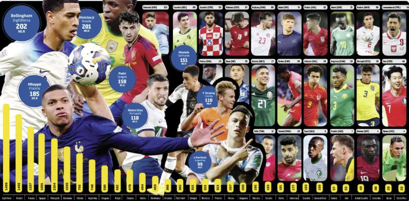 Non solo il Mondiale più costoso e sfarzoso di sempre, non solo il Mondiale ospitato dal Paese con il Pil pro capite più alto al mondo, ma anche un torneo iridato che metterà in campo rose da 15 miliardi di euro. È questo il valore di trasferimento complessivo stimato dall’Osservatorio del Cies, che da quasi un decennio utilizza l’approccio econometrico per valutare il valore di mercato dei calciatori professionisti su base scientifica. I singoli valori dei 26 convocati di ogni nazionale sono stati sommati per ottenere il valore totale delle 32 rose delle selezioni qualificate, che porteranno a Doha 83 1 calciatori da ogni parte del pianeta. Si va da un minimo di 23 milioni di valore per il Costa Rica di Keylor Navas al (quasi) miliardo e mezzo per tutti i convocati dell’Inghilterra.