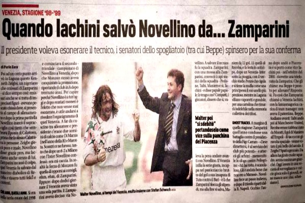 “Ai tempi del Venezia, nella stagione 1998-99 il presidente Zamparini voleva esonerare il tecnico, i senatori dello spogliatoio, tra cui Iachini spinsero per la sua conferma. Walter poi si sdebitò portandoselo come vice sulla panchina del Piacenza”. Questo quanto racconta l’edizione odierna de “Il Corriere dello Sport” in merito al rapporto e le coincidenze tra Iachini e Novellino, passato e presente del Palermo che si danno cambio sulla panchina più rovente d’Italia.