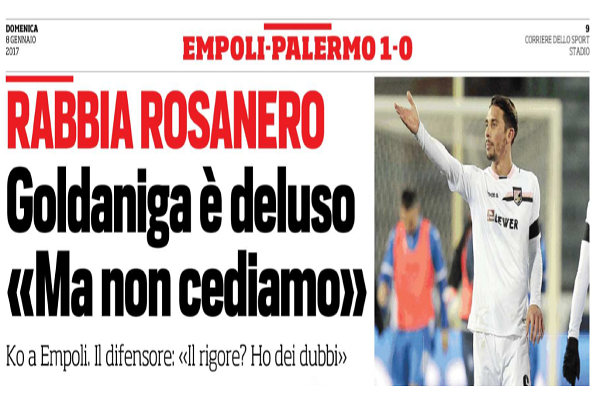 secondo il difensore rosanero Edoarlo Goldaniga. «Avevamo disputato una buona gara. L’episodio dubbio, devo ancora rivederlo, ma per me non c’era il rigore» ha affermato il centrale di sinistra della retroguardia Sici- liana al termine della partita persa contro l’Empoli. Il Palermo però non si aggrappato all’arbitraggio. Qualche protesta anche per un contatto in area di rigore tra Rispoli e Krunic, ma l’arbitro non ha concesso il penalty e ha amrnonito Gazzi per proteste. «Un pareggio o una vittoria ci avrebbero permesso di rimanere ancora piü vicini alla zona salvezza – ha aggiunto Goldaniga – Ora, tra noi e l’Empoli ci sono sette punti, ma non molliarno perchè manca tutto un grone di ritorno». […]”. Questo quanto riportato da “Il Corriere dello Sport”.
