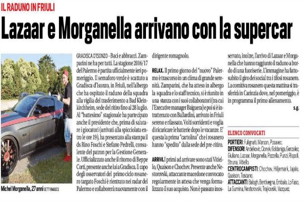 “Baci e abbracci. Zamparini ne ha per tutti. La stagione 2016/17 del Palermo è partita ufficialmente ieri pomeriggio. Il semaforo verde è scattato a Gradisca d’Isonzo, in Friuli, nell’albergo che ha ospitato il raduno della squadra alla vigilia del trasferimento a Bad Kleinkirchheim, sede del ritiro fino al 28 luglio. Al “battesimo” stagionale ha partecipato anche il presidente che, prima di salutare i giocatori (arrivati alla spicciolata entro le ore 19), ha presentato alla stampa il ds Rino Foschi e Stefano Pedrelli, consulente del patron per la Gestione Generale. Ufficializzato anche il ritorno di Beppe Corti, presente anche lui a Gradisca. Il capo degli osservatori del primo ciclo rosanero targato Foschi è rientrato nei radar del Palermo e collaborerà nuovamente con il dirigente romagnolo. RELAX. Il primo giorno del “nuovo” Palermo è trascorso in un clima di grande serenità. Zamparini, che ha atteso in albergo la squadra e lo staff tecnico, si è riunito in una stanza con i suoi collaboratori (tra cui l’Executive manager Baiguera) e poi si è intrattenuto con Ballardini, arrivato in Friuli sereno e rilassato. Volti sorridenti e voglia di ricaricare le batterie dopo le vacanze. E’ questa la prima “cartolina” che i rosanero hanno “spedito” dalla sede del pre-ritiro. ARRIVI. I primi ad arrivare sono stati Vitiello, Quaison e Chochev. Presente anche Nestorovski, attaccante macedone convocato regolarmente in attesa che venga formalizzato il suo acquisto. Non è passato inosservato, inoltre, l’arrivo di Lazaar e Morganella che hanno raggiunto il raduno a bordo di una fuoriserie. L’immagine ha fatto subito il giro dei social tra i tifosi rosanero. La comitiva rosanero questa mattina si trasferirà in Carinzia dove, nel pomeriggio, è in programma il primo allenamento.” Questo quanto riportato dall’edizione odierna del “Corriere dello Sport”.