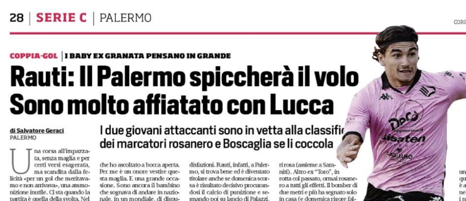 L’edizione odierna del “Corriere dello Sport” si sofferma sulle prestazioni di Nicola Rauti, attaccante del Palermo.