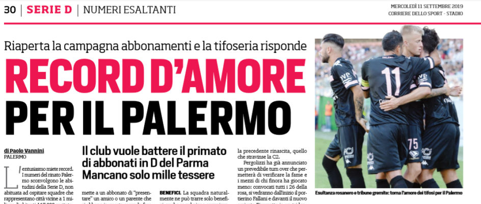 Corriere dello Sport: “Record d’amore per il Palermo. Il club vuole battere il primato di abbonati in D del Parma. Mancano solo mille tessere”
