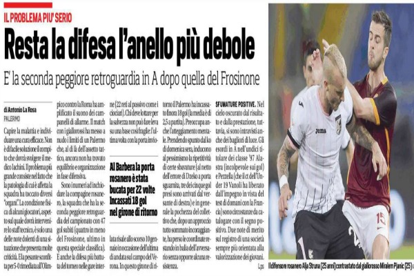 “Il problema più serio è la difesa rosanero, la peggiore retroguardia in A dopo quella del Frosinone”. Questo titola l’edizione odierna de “Il Corriere dello Sport” che poi prosegue: “Capire la malattia e individuare una cura efficace. Non è di facile soluzione il compito che dovrà svolgere il medico Iachini. Il problema più grande consiste nel fatto che la patologia di cui è affetta la squadra ha toccato diversi organi. La condizione fisica di alcuni giocatori, aspetto sul quale dovrà intervenire lo staff tecnico, è solo una delle note dolenti di una situazione che presenta molte criticità. E la pesante sconfitta per 5-0 contro al Roma all’Olimpico ha amplificato il suono dei campanelli di allarme. Il match con i giallorossi ha messo a nudo i limiti di un Palermo che al di là dell’assetto tattico, ancora non ha trovato equilibrio e organizzazione in fase difensiva. Sono i numeri ad inchiodare la compagine rosanero, la squadra che ha la seconda peggiore retroguardia del campionato con 47 gol subiti. E anche la difesa più battuta del torneo nelle gare interne (22 reti al passivo, al Barbera, proprio come i ciociari). Chi deve lottare per la salvezza non può far leva su una base così fragile […]”.