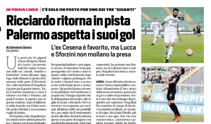 L’edizione odierna del “Corriere dello Sport” si sofferma sul dubbio principale di Pergolizzi in vista della sfida col Nola: la punta centrale. A giocarsi i galloni da titolare sono Ricciardo, Sforzini e Lucca. L’ago della bilancia pende in direzione di Ricciardo, pronto per il grande rientro secondo Pergolizzi. Ma anche Sforzini e Lucca hanno voglia di rivalsa. Ricciardo, cannoniere rosa con 9 gol, non segna su azione dal 3 novembre e nelle ultime quindici giornate ha racimolato solo un rigore. Sforzini, dopo aver siglato tre gol in due gare, è finito in panchina e chiede una nuova chance. Lucca è la mina vagante, dopo aver bagnato col gol il proprio esordio contro il Biancavilla. Ricciardo è pronto a zittire i suoi detrattori, dopo critiche e digiuno prolungato. Sforzini non si arrende, vive il calcio a tempo pieno e senza limiti. Pergolizzi farà fatica a tenerlo nelle retrovie. Lucca cresce all’ombra dei due senatori, senza responsabilità e tensioni. Lorenzo ha l’aspetto di chi, subentrando, può decidere le partite. A Licata ha trascinato i compagni con due quasi assist e un gol sfiorato.