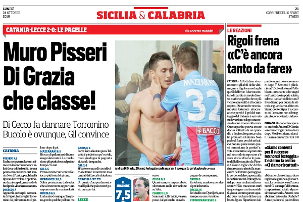 “A Padalino stanno stretti gli abiti della vittima, ma a Rigoli vanno larghi quelli dell’eroe. I due raccontano la partita in modo diverso, ma forse quello che va più vicino alla realtà è il tecnico ospite: «Diciamo che non siamo stati fortunati – attacca – anche perché il gol del vantaggio del Catania è arrivato su deviazione e dopo una nostra buona azione offensiva. Questa partita poteva essere decisa soltanto da un episodio e l’episodio questa volta ha premiato il Catania. Non parlo di furto, perché nel calcio non mi piace usare questi termini, ma la partita l’avete vista tutti e soprattutto nel secondo tempo non c’è stata storia: diverse le parate difficili eseguite da Pisseri. Ciò non toglie che debbo rimproverare ai miei la mancanza dell’ultimo passaggio e la gestione del recupero palla in certi momenti. Imborghesiti dopo nove risultati utili consecutivi? No, ma se non entri in queste gare con la mentalità giusta, contro queste squadre puoi rischiare di fare una brutta figura. Ripartiamo dallo stop, consapevoli di quel che si prova prendendo anche due reti e diamoci dentro: il campionato è tutto da giocare». La versione di Rigoli: «Abbiamo concesso pochissimo e siamo stati padroni del campo contro una squadra forte. Ci sono dei ragazzi in crescita ed è evidente che queste partite non si possono vincere dopo 5′. Semmai è più facile all’85’. Noi fortunati? Abbiamo preso tante volte un gol nell’unico tiro in porta subìto, adesso parliamo di fortuna? Prendiamo per buona la vittoria e guardiamo al futuro. Siamo contenti per il successo col Lecce, ma non si festeggia. Ancora c’è tanto da fare». DI GRAZIA. Un concetto espresso anche da Andrea Di Grazia: «Avevamo voglia di riscattarci dopo Melfi e ci siamo riusciti. La mia esultanza? Col 2-0 abbiamo chiuso la partita e tagliato le gambe agli avversari. La deviazione sull’uno a zero? Ci sta un po’ di fortuna, ma pensiamo subito al prossimo avversario. Ancora non abbiamo fatto nulla. Dediche? A mio padre e al padre di un amico che non c’è più». Arriva Saro Bucolo: «Abbiamo vissuto una settimana davvero difficile. Siamo stati bravi a tapparci le orecchie e a lavorare, dimostrando di avere gli attributi: se avessimo ascoltato quel che si diceva all’esterno non ne saremmo più usciti».”. Questo quanto si legge sull’edizione odierna de “Il Corriere dello Sport”.