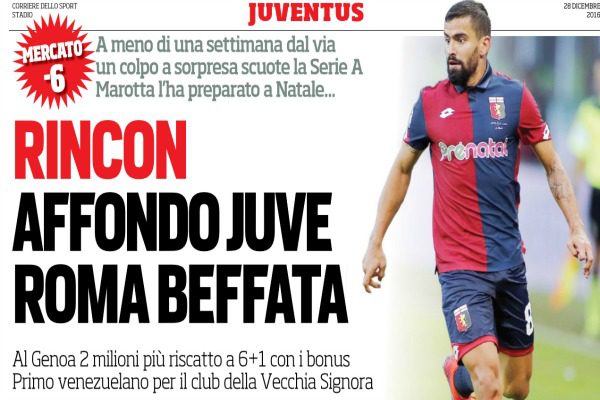 Corriere dello Sport: “Rincon affondo Juve, Roma beffata. Al Genoa 2 milioni più riscatto a 6+1 con i bonus”