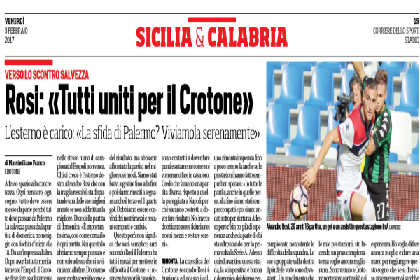 Corriere dello Sport: “Rosi: «Tutti uniti per il Crotone». L’esterno è carico: «La sfida di Palermo? Viviamola serenamente»”