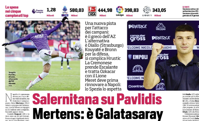 Corriere dello Sport: “Salernitana su Pavlidis. Mertens: è Galatasaray. Tutte le trattative del giorno in serie A”
