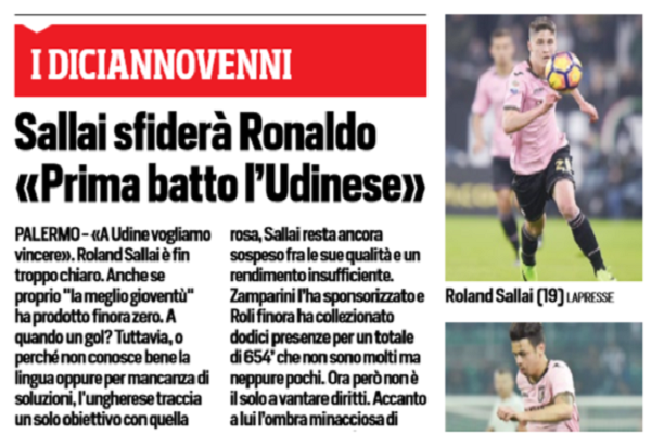 “«A Udine vogliamo vincere». Roland Sallai è fin troppo chiaro. Anche se proprio “la meglio gioventù” ha prodotto finora zero. A quando un gol? Tuttavia, o perché non conosce bene la lingua oppure per mancanza di soluzioni, l’ungherese traccia un solo obiettivo con quella sfacciataggine con cui voleva battere il rigore al posto di Nestorovski: «Sono felicissimo di giocare contro un mito, cioè Ronaldo, ma prima è importante superare l’ostacolo di Udine. Baccaglini ha una grande personalità, noi lavoriamo per salvarci». Dal purgatorio al paradiso. Dal Palermo dove non ha una maglia assicurata, alla sfida del 25 marzo contro il campione dei campioni, Ronaldo, e i vincitori dell’ultimo europeo. Bernd Storck, ct magiaro, gli offre l’occasione più prestigiosa della giovane carriera perché «bisogna dare un’occhiata ai talenti emergenti e fornire loro l’opportunità di provare». Come ha fatto Lopez. […]”. Questo quanto si legge su “Il Corriere dello Sport”.