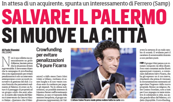 L’edizione odierna del “Corriere dello Sport”, parla dell’iniziativa di crowdfunding promossa dall’imprenditore Mirri per evitare penalizzazioni che potrebbero scattare qualora il Palermo non saldasse gli stipendi il prossimo 16 Marzo. Le trattative per la cessione delle quote portate avanti da Foschi e dallo stesso Mirri, rischiano ancora di avere tempi troppo lunghi e si deve trovare quindi una possibile soluzione di emergenza. Le ultime indiscrezioni parlano anche in un interessamento da parte del patron della Sampdoria, Massimo Ferrero, che potrebbe prendere il club rosanero qualora riuscisse a cedere proprio il club blucerchiato. Intanto però, Mirri vuole coinvolgere direttamente la città di Palermo per cercare di definire una raccolta fondi che costituirebbe un aiuto importante per le scadenze della società. Chiunque potrà contribuire alla salvezza del Palermo, anche non si tratta certo di azionariato popolare, ma piuttosto di una soluzione tampone per gestire nel brevissimo periodo le spese. Si pensa intanto ad un comitato di garanzia da costituire che sarà composto da tifosi illustri come Salvo Ficarra, che ha espresso un sì ma con riserva, e Padre Cosimo Scordato, noto a tutti per il suo grande amore per il Palermo.