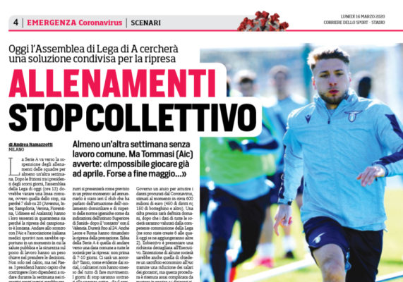 Corriere dello Sport: “Serie A. Allenamenti, stop collettivo. Tommasi (Aic) avverte: «Impossibile giocare già ad aprile»