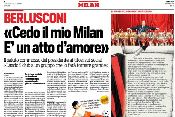 Corriere dello Sport, serie A: “Berlusconi, «Cedo il mio Milan. E’ un atto d’amore»