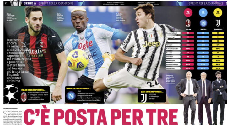 Corriere dello Sport: “Serie A, due posti ancora da assegnare, una sola partita a testa. Oggi sapremo chi tra Milan, Napoli e Juventus resterà fuori dal torneo più importante”