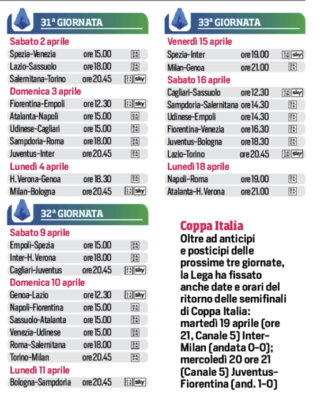 Corriere dello Sport: “Serie A. Inter-Milan di coppa, il 19 aprile Napoli-Roma si gioca a Pasquetta”