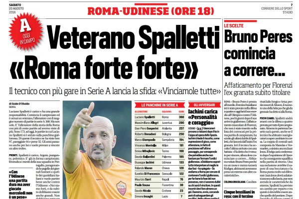 “Luciano Spalletti è carico e ha una grande responsabilità. Comincia il campionato ed è ormai un veterano, l’allenatore con il maggior numero di partite in serie A: 368. Ma non solo. E’ l’allenatore della storia della Roma con più di cento partite ad averne vinte di più. Sono 173, ad oggi, le partite in cui Luciano Spalletti si è seduto sulla panchina giallorossa. Di queste il tecnico ne ha vinte ben 97, pareggiate 44 e perse 32. Gli anni passano anche per lui e vuole provare a vincere un altro trofeo. PRONTI. Spalletti è carico. Arguto, pungente, polemico. E’ già in forma campionato. Rivendica i meriti della sua squadra in Portogallo, paragonando le pagelle dei giornali lusitani a quelle dei quotidiani italiani e vuole partire bene anche contro l’Udinese: «Noi siamo forti, e da subito dobbiamo essere anche grandi. Non dobbiamo pensare solo alla Juve, noi vogliamo vincerle tutte, vogliamo montare sopra tutto ciò che passa, ma poi bisogna confrontarsi con le altre squadre. Anche con chi è arrivato dietro di noi nella passata stagione. E non pensate che Milan e Inter siano inferiori a noi». Spalletti non sottovaluta l’Udinese, dove ha cominciato il percorso da grande allenatore: «E’ una squadra forte. Hanno giovani talenti e sanno farli giocare bene. Sarà sicuramente una partita dura, ci sarà da lottare, ma non hanno più Di Natale che ha smesso, e senza di lui perdono sicuramente qualcosa». La Roma dopo la partita contro il Porto ha qualcosa in più e non qualcosa in meno: «Non penso sia un peso aver giocato mercoledì, da quella sfida ne siamo usciti bene. La squadra ha dimostrato di essere pronta, ne traiamo una spinta in positivo, siamo consapevoli della nostra forza». LE SCELTE. La società lo ha accontentato sul mercato. A Spalletti questa Roma piace: «Io di questo gruppo mi fido moltissimo. Come ho detto ai giocatori, ho una delle formazioni più forti da quando faccio l’allenatore. E’ forte forte». Quest’anno la rosa è vasta e non potrà accontentare tutti: «Farò la formazione scegliendo sempre i migliori, senza farmi influenzare dai sentimenti. E se qualcuno viene al campo con il broncio resta fuori anche nella partita successiva». Tra le scelte da fare c’è anche quella del portiere: «Mercoledì ho preferito Alisson perché Szczesny si era allenato poco. Il polacco ha meritato di giocare questa partita, anche El Shaarawy, ma poi si fanno le scelte. Si sceglie in base a quello che è più forte al momento. Il calcio è cambiato, si corre di più in ogni partita e si possono avere due portieri sullo stesso piano. Se lo scorso anno sin dall’inizio non è stato così, con me adesso sarà diverso». PAREDES MEGLIO DI PJANIC. Spalletti poi mette in chiaro una cosa, prima di completare i preliminari di Champions con la partita di ritorno: «Noi non abbiamo la responsabilità dei mancati introiti economici della Roma. Noi casomai dobbiamo dare a questi giocatori il merito di aver creato l’opportunità di giocarsi questa possibilità di entrata. Vanno ringraziati». Il mercato è ancora aperto e il tecnico sembra convinto a confermare Paredes. Promuove l’argentino e saluta definitivamente Pjanic: «Strootman e Paredes sono più forti di Pjanic. Anche Gerson ha qualità, ma si deve calare nel nostro calcio. Con l’arrivo di Bruno Peres, Florenzi può giocare più avanti»”. Questo quanto si legge su “Il Corriere dello Sport”.