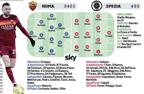 Corriere dello Sport: “Serie A. Oggi Roma-Spezia, le probabili formazioni”