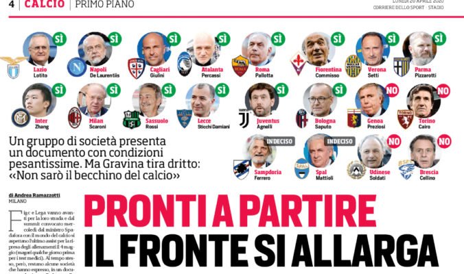 L’edizione odierna del “Corriere dello Sport” si sofferma sui club di Serie A pronti a ripartire. Ieri, il Milan ha ingrossato il fronte delle società pronte a tornare in campo attraverso le dichiarazioni del presidente Scaroni, favorevole alla ripresa della stagione sportiva. Lo stesso concetto è stato espresso dall’Inter, seppur formalmente. Sul loro cammino, FIGC e Lega troveranno dei sassolini posti dalle società medio-piccole, influenzate da interessi per non ripartire: hanno preparato un documento nel quale pongono quesiti preliminari alla presentazione del nuovo calendario per concludere la stagione.