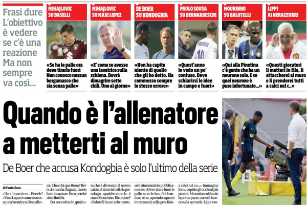 Corriere dello Sport, serie A: “Quando è l’allenatore a metterti al muro. De Boer che accusa Kondogbia è solo l’ultimo della serie”