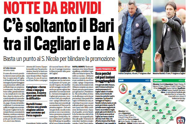 Corriere dello Sport: “Serie B, anticipo 40ª: notte da brividi. C’è soltanto il Bari tra il Cagliari e la A. Basta un punto al S.Nicola per blindare la promozione”