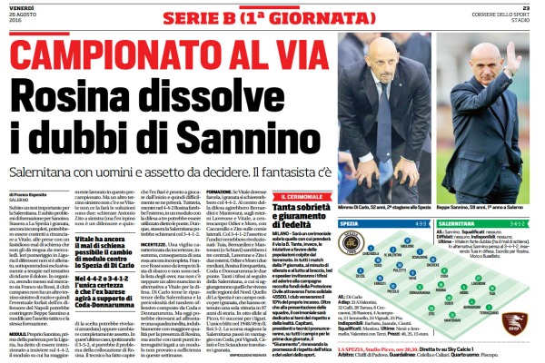 Corriere dello Sport: “Serie B, campionato al via: Rosina dissolve i dubbi di Sannino. Salernitana con uomini e assetto da decidere. Il fantasista c’è”