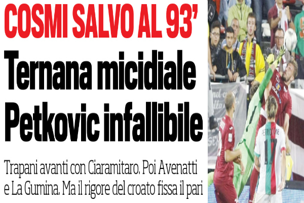 Corriere dello Sport serie B: “Cosmi salvo al 93’, Ternana micidiale Petkovic infallibile. Trapani avanti con Ciaramitaro. poi Avenatti e La Gumina. Ma il rigore del croato fissa il pari”