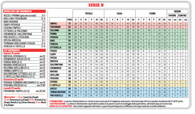La serie B si avvia alla volata finale. Nella giornata di ieri si è giocata la 36^ giornata, ma le squadre sono già pronte per tornare in campo già sabato. In alto la classifica aggiornata e il programma della 37^ giornata.