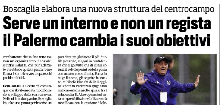 L’edizione odierna del “Corriere dello Sport” parla di un possibile innesto nella zona mediana del campo. La società rosanero non è però alla ricerca di un regista, bensì di un interno che abbia anche la predisposizione al gol. Nelle ultime uscite, Boscaglia ha infatti impiegato 3 centrocampisti, ottenendo maggiore equilibrio in campo.