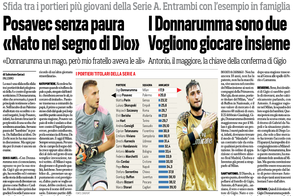 “La sua è una sfida nella sfida: tra i portieri titolari più giovani della A e contro il generale scetticismo. E Donnarumma, oltre che avversario, è pure il principale testimone a favore. Nell’incubo di un Palermo sballottato tra sconfitte e record negativi, Josip Posavec, infatti, ha dovuto bruciare le perplessità di una scelta che sembrava azzardata. Avevano paura del “bambino” in porta. Da Ballardini ai tifosi. De Zerbi non lo ha mai messo in discussione. Ma ogni partita per il croato è ancora un esame. QUASI AMICI. «Con Donnarumma non ci conosciamo, ognuno va per la sua strada. Gigi è già un personaggio, ha esordito ed è entrato nella storia della nazionale. Il mio sogno era di diventare un giorno come Buffon e Casillas. Ho solo salito i primi due gradini: l’esordio l’anno scorso ed ora la maglia numero uno da difendere ad ogni prestazione. Non è una questione d’età, mi rendo conto che io e Donnarumma insieme non facciamo gli anni di Buffon, ma di convinzioni. Gigi per me è una specie di garante indiretto avendo bruciato i tempi. Tra noi portieri, del resto, esistono solidarietà e affetto spontanei, come in nessun altro ruolo. Di Donnarumma posso soltanto dire cose positive. E’ più che giovane, una magia a quell’età. E ha testa, si vede. Uno dei migliori calciatori del Milan. Ed è per questo che alla fine gli chiederò la maglia come ricordo di un’altra giornata straordinaria». NATO PORTIERE. Si credeva Superman quando si tuffava da palo a palo, stregato dal fratello. «Sembrava avesse le ali, io cercavo di imitarlo». Passione trasmessa a entrambi da papà, il primo a parare nello stesso club dal quale poi Josip sarebbe partito anni dopo. In questa stagione, Posavec un paio di volte è andato a sbattere: contro il Napoli il primo errore, peraltro ininfluente, poi la serataccia di Roma. Da dimenticare. E oggi il Milan. Sempre senza paura. Per uno che in campo fa il segno della croce oppure alza i diti indici al cielo nel gesto di una semplice invocazione, tutto è scritto. «Il Milan è squadra giovane e di grande qualità, farà bene. Sono pronto e felice di… prenotare un appuntamento così prestigioso, d’altra parte se voglio arrivare, debbo crederci, non importa il nome dell’avversario. Esistono partite difficili, non partite impossibili». Il suo segno zodiacale: pesci. Come Donnarumma. «Semplice coincidenza. Dio è la mia fede e non mi interessa sapere se sono Pesce o… carne. Voglio essere me stesso. Palermo è una città bellissima, clima perfetto. E i tifosi sono caldi, i migliori al mondo. Il mio obiettivo è dare sempre di più per me, per il Palermo e per loro». Nel tentativo di salire il terzo gradino, quello che più piace a Zamparini: consacrazione e ricca plusvalenza. L’affare c’è già: Posavec è costato 500.000 euro. […]. DONNARUMMA Non ha ancora 18 anni, non ha la patente, non ha la macchina, vive ancora nel convitto del Milan insieme ai suoi excompagni della Primavera. Ma è già, da un anno ,portiere titolare del Milan, “vice” di Buffon in Nazionale, e il suo valore di mercato è di almeno 60 milioni di euro. Il 25 febbraio Gianluigi, Gigio, Donnarumma diventerà maggiorenne ma per il Milan è già diventato un problema. I nuovi padroni cinesi, infatti, dovranno trovare il modo di “blindarlo” con un contratto tale da evitare qualsiasi pericolosa tentazione. In ordine di apparizione ci sarebbero almeno Real Madrid, Chelsea e Juventus già pronti a strapparlo al Milan. SANT’ANTONIO. Il Diavolo, a questo punto, dovrebbe appellarsi al fratello di Gigio, Antonio, di 9 anni più… anziano, il vero e unico mentore di Gigio. Nato e cresciuto, anche come portiere, nel cono d’ombra (per poco tempo…) del fratellone che a sua volta ha lasciato ancora bimbo Castellammare di Stabia per trasferirsi al Vismara, la “culla” dei baby prodigio rossoneri. Gigio è diventato portiere e, soprattutto, milanista anche per questo motivo. Voleva essere anche lui come Antonio, che, comunque, già da qualche anno aveva sentenziato: «Gigio diventerà più bravo e forte di me». Adesso Antonio (26 anni) è emigrato nella prima divisione greca. È stato ingaggiato dall’Asteras Tripolis, dopo una stagione trascorsa al Genoa alle spalle di Perin e Lamanna. DESIDERIO. Bene, fra i desideri di Gigio ci sarebbe quello di ritrovarsi, anche calcisticamente parlando, con Antonio. A maggior ragione nel Milan, la squadra dei loro sogni da bambini. Questa ipotesi era già stata accarezzata la scorsa estate, ma il ritorno di Gabriel da Napoli e la situazione piuttosto complicata di Diego Lopez, che solo a fine mercato ha trovato l’accordo con l’Espanyol, ha impedito il ricongiungimento a Milanello. Gigio Donnarumma, fino a questo momento, ha manifestato fede assoluta al Milan. Ma questa convinzione potrebbe essere resa ancora più robusta proprio dal fatto di poter ritrovare Antonio dopo tanti anni trascorsi lontani l’uno dall’altro. SCENARI. Quindi il destino di Gigio Donnarumma potrebbe essere legato a quello del fratello Antonio. Anche se, come sembra, il testimone adesso passa alla nuova dirigenza milanista. I padroni cinesi, ovviamente, non potranno presentarsi al popolo rossonero lasciandosi scappare quello che potrebbe diventare uno dei portieri più forti del calcio italiano. Anche perché Donnarumma ha qui a Milanello numerosi… fratellini (Locatelli, Calabria, De Sciglio, Zanellato, Niang e Suso) che piacciono in tutta Europa. Ma, soprattutto, ai tifosi del Milan…”. Questo quanto riportato da “Il Corriere dello Sport”.