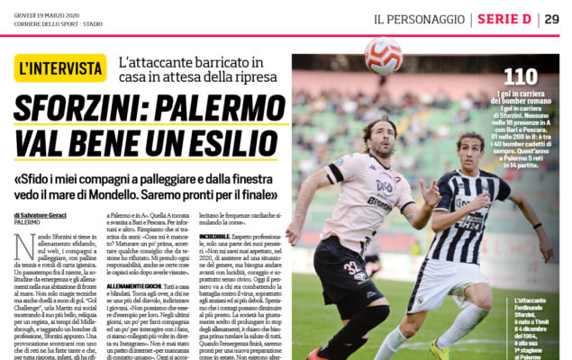 La sospensione degli allenamenti costringe tutti i calciatori del Palermo ad arrangiarsi e allenarsi in casa. Anche Ferdinando Sforzini è costretto a farlo e cerca di far passare le giornata sfidando i compagni, tramite Instagram, a palleggiare con palline da tennis e rotoli di carta igienica. Tra questi anche sfide a suon di gol con il compagno Martin che pubblica un suo gol siglato ai tempi del Middlesbrough e taggando appunto Sforzini che, per tutta risposta, gli ha pubblicato una serie di video con i suoi gol. Il bomber sa bene che il momento è travagliato e dovrà mettersi a disposizione dei suoi compagni anche per il finale di stagione e per raggiungere la Serie C, ma anche «Proseguire la carriera a Palermo e in A». Quella Serie A che, scrive l’edizione odierna de “Il Corriere dello Sport”, ha toccato con Bari e Pescara, questo è un rimpianto che si trascina da anni: «Cosa mi è mancato? Maturare un po’ prima , accettare qualche consiglio che testone ho rifiutato. Mi prendo ogni responsabilità, anche se certe cose le capisci solo dopo averle vissute».