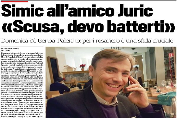 “Erano amici, meglio lo sono ancora. Solo che le loro strade da qualche anno si sono divise. Uno di Zagabria (Simic), protagonista in Italia, cento partite con la nazionale croata, nuovamente ammaliato dalle sirene del calcio mollate a suo tempo per una vita diversa; l’altro di Spalato (Juric), oggi allenatore emergente in un mondo che, se non fai scoppiare la scintilla, ti stronca. A Juric l’impresa è riuscita col Genoa che domenica affronta il Palermo al contrario, per esempio, di De Zerbi, travolto dalle sconfitte in serie. Simic e Juric entrambi quarantuno anni, così vicini fino alla Under 21, così lontani per carriera e risultati. Uniti dalle ambizioni e da un episodio che Dario ricorda con grande piacere: «Eravamo giovani, i nostri avversari si chiamavano Del Piero e Inzaghi. Io e Ivan facevamo vita in comune nelle varie rappresentative. Un giorno mi invitò a Spalato, a casa sua. Furono sette giorni intensi e gioiosi. Mi trattavano come un figlio. Suo padre amava la musica e mi coinvolgeva facendomi ascoltare canzoni impegnative, di sinistra. Sprizzava energia, trasparenza, un uomo senza peli sulla lingua. Come Ivan. Poi ci siamo persi di vista, ognuno per il suo sentiero ma il legame resta. Ivan sta svolgendo un bel lavoro col Genoa e non solo. È stato anche a Palermo con Gasperini, in un anno deludente. I talenti esistono, bisogna riconoscerli. L’avesse preso il Palermo all’inizio di questa stagione, forse ci avrebbero considerati matti. Lo rivedrò volentieri, ma l’amico sa bene che siamo a caccia di punti». Juric dunque avvisato.