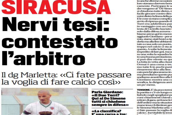 Corriere dello Sport, altre siciliane: “Siracusa nervi tesi, contestato l’arbitro. Il dg Marletta: «Così ci fate passare la voglia di fare calcio»”