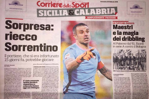 Potrebbe scendere in campo già oggi contro il Bologna capitan Stefano Sorrentino. Il numero 70 rosanero, infatti, ha recuperato in soli 15 giorni dall’infortunio muscolare subito contro il Torino e la sua carica in questo momento potrebbe essere vitale per il Palermo. Il portiere ex Chievo è già da diversi giorni che ha intensificato il lavoro per recuperare il prima possibile, per lui giocare oggi sarebbe anche una rivincita personale per cancellare la papera di tre anni fa proprio contro i felsinei. Per battere il Bologna servirà anche l’appoggio dei tifosi, ma al”Renzo Barbera” sono attesi circa 15mila spettatori, complice probabilmente un orario che storicamente non ha portato fortuna agli uomini di Iachini. C’è però un’eccezione, si tratta del match di andata vinto a Bologna proprio alle 12.30.