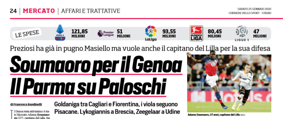 Corriere dello Sport: “Soumaoro per il Genoa. Il Parma su Paloschi. Tutte le trattative del giorno in serie A”