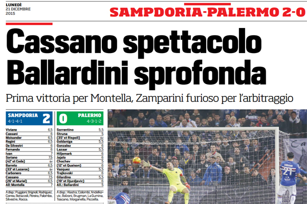 “Dopo 3 sconfitte e un pareggio in campionato e l’eliminazione in Coppa Italia contro il Milan, finalmente l’aeroplanino Montella ha preso quota, con un successo abbastanza netto sul Palermo di Ballardini che si era illuso, dopo la vittoria contro il Frosinone, che il peggio fosse passato. La Samp in questo modo ha abbandonato la zona calda della bassa classifica, mentre il Palermo deve ringraziare il Milan che ha stoppato il Frosinone, rimasto buon terz’ultimo. Comunque c’è poco da stare allegri in un campionato che ormai ha i connotati di un vero e proprio calvario. FERRERO. Il presidente blucerchiato ha sentito e vissuto questa sfida con più partecipazione del solito, trascorrendo gran parte del primo tempo in piedi. Camminando nervosamente in tribuna d’onore, pregando, alzando le mani e gli occhi al cielo. Ma nel primo tempo gli scongiuri e la sofferenza del blucerchiato non sono serviti a molto. Almeno però Ferrero si è goduto un Cassano rigenerato e ritrovato, protagonista della migliore prestazione da quando è tornato a indossare la maglia blucerchiata. Nella ripresa Ferrero si è rianimato e alla fine ha esultato anche lui. Il sospetto di aver sbagliato nel cambio Zenga-Montella non l’aveva mai sfiorato ma un altro passo falso sarebbe stato sicuramente mortificante. ZAMPARINI FURIOSO. Gli errori arbitrali di Fabbri hanno mandato su tutte le furie Zamparini, che in serata si è sfogato con un durissimo comunicato: «E’ scandaloso il comportamento tenuto dall’arbitro Fabbri. Se vogliamo classificare come errori i ben tre rigori a favore non fischiati al Palermo, questo soggetto deve andare a scuola di arbitraggio prima di tornare a provocare danni sui campi di calcio. Nella mia lunga vita da Presidente mai era capitata tanta incapacità contro le mie squadre e mai errori così clamorosi ripetuti…». CASSANO. Relegato Muriel in panchina (dopo la prova non brillantissima contro il Milan in Coppa Italia), Montella si è affidato al solo Cassano in attacco. E l’ex-Bari si è preso sulle spalle la Samp disputando un primo tempo di grande sostanza. Al 25′, dal limite dell’area, ha calciato al volo di sinistro ma il pallone ha sorvolato di poco la traversa. I doriani si sono rifatti vivi al 45′: punizione di Fernando con grande parata in angolo di Sorrentino. Ma Cassano è rientrato in campo nella ripresa ancora più carico e volitivo. L’assist (8′) per Soriano, già innescato una prima volta nei 45′, è stato questa volta vincente. DOPPIO RIGORE. Il Palermo ha disputato un primo tempo di attesa, sperando di sfruttare al meglio le ripartenze, ma Viviano non ha mai corso seri pericoli. I rosanero hanno recriminato nel primo tempo (20′) per un fallo da rigore subito da Gilardino, trattenuto da Cassani a due passi dalla porta. In effetti potevano esserci gli estremi per la massima punizione. Ma l’arbitro Fabbri ha commesso un altro errore, proprio al 49′ della ripresa, non concedendo un altro penalty per fallo di Lazaros su Djurdjevic. Che è stato addirittura ammonito per simulazione… CAMBI. Ballardini ha cercato di porre rimedio alla situazione di svantaggio con due cambi ravvivcinati. Al 12′ Quaison è subentrato al posto di Chochev (decisamente deludente) mentre al 19′ è stato richiamato in panchina Gilardino per fare posto a Djurdjevic. Montella ha risposto con Muriel al posto di Cassano, acclamato dai 20.000 di Marassi proprio come accadeva ai tempi d’oro. Ma la partita non è cambiata. Il Palermo ha stentato a riprendere quota mentre la Samp si è difesa con ordine, corroborata dal risultato che lasciava presagire, finalmente, la prima vittoria di Montella in questo suo soffertissimo avvio sulla panchina blucerchiata. GAME OVER. Il Palermo invece è stato costretto ad arrendersi definitivamente poco dopo la mezz’ora quando Ivan (servito da Muriel) ha beffato Sorrentino con un velenosissimo pallonetto. Al 40’ l’ultima occasione del Palermo: Trajkovski è partito verso la porta doriana ma Viviano si è superato respingendo il rasoterra”. Questa l’analisi di Sampdoria-Palermo condotta dall’edizione odierna de “Il Corriere dello Sport”