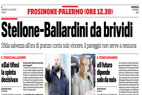 Corriere dello Sport: “Stellone-Ballardini da brividi, il tecnico rosanero: «Il futuro dipende solo da noi»”