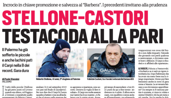 Anche “Il Corriere dello Sport” analizza il tabù delle piccole, tutto da sfatare questo pomeriggio al “Barbera” contro il Carpi. I rosanero, infatti, hanno già perso punti un questo girone di ritorno contro Livorno, Foggia e Crotone. Quest’oggi tocca alla squadra di Castori affrontare i rosanero, da sempre osso duro per la squadra siciliana. Il quotidiano ricorda che fu proprio in questo stadio che Castori festeggiò col Carpi il 1º punto in A della storia. L’incontro di oggi ha doppia validità, sia per le parti alte della classifica che per quelle basse, per una sfida che si preannuncia alla pari.
