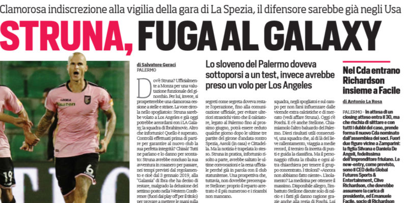 L’edizione odierna de “Il Corriere dello Sport” lancia la clamorosa indiscrezione che vedrebbe Aljaz Struna approdare al Los Angeles Galaxy di Ibrahimovic. Ecco quanto riportato: “Dov’è Struna? Ufficialmente a Monza per una valutazione funzionale del ginocchio. Per lui, invece, si prospetterebbe una clamorosa cessione a stelle e strisce. La voce circola nello spogliatoio: Struna sarebbe volato a Los Angeles e già oggi potrebbe accordarsi con i Los Angeles Galaxy, la squadra di Ibrahimovic. Altro che infortunio! Quello è superato. […] Tutti ne parlano e lo danno per scontato: Struna avrebbe concluso la sua avventura in rosanero per passare alla “Galassia” di Ibra. […] Fermo da metà novembre per un infortunio rimediato con la propria nazionale, lo sloveno, anche in estate aveva dato segnali di irrequietezza nel ritiro di Sappada. […] Struna avrebbe saltato le ultime convocazioni e la cena ufficiale perché già in parola con il club statunitense”.