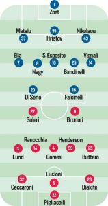 Spezia A disp.: 40 Zovko, 33 Gelashvili, 36 Candelari, 5 Tanco, 2 Wisniewski, 11 Cipot, 97 Jagiello, 99 Kouda, 13 Reca, 99 Verde, 9 F.Esposito, 24 Moro. Ind.: Cassata, Mühl, Jureskin e Crespi. Diff.: Mühl. Ultime: In attacco in tre per una maglia. Favorito Di Serio su Pio Esposito e Verde. All.: Mignani.