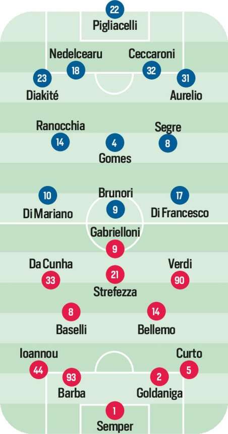 A disposizione: 12 Nespola, 13 Kanuric, 15 Marconi, 25 Buttaro, 6 Stulac, 20 Vasic, 53 Henderson, 80 Coulibaly, 7 Mancuso, 11 Insigne, 27 Soleri, 70 Traorè . Indisponibili: Desplanches, Lucioni, Graves, Lund.