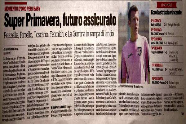 “La linea verde è il ‘core business” del Palermo? La dirigenza, in realtà intenzionata ad insistere sulla valorizzazione dei giovani in realtà non avrebbe bisogno di esplorare nuove frontiere. Bisognerebbe allargare lo zoom tra le mura domestiche per accorgersi che in casa rosanero è scoppiato un vero e proprio baby boom. Merito della Primavera che sta attraversando un momento magico sancito dalle sei vittorie ottenute nelle ultime gare di campionato. Il terzo posto a quota 31 punti ad una sola lunghezza dal Frosinone secondo del Girone C, in termini di soddisfazioni rappresenta comunque un traguardo per i ragazzi di Bosi. […] Il segreto di questo exploit è il collettivo, ma è innegabile che risulta sempre decisiva l’impronta dei singoli. Elementi come i difensori Pirrello e Pezzella, i centrocampisti Toscano e Ferchichi e l’attaccante La Gumina consolidano la base sulla quale impostare un progetto vincente. I nomi in questione peraltro, gravitano nell’orbita della prima squadra e la loro presenza nei piani superiori è un’altra vittoria della Primavera”. Questo quanto si legge sull’edizione odierna de “Il Corriere dello Sport” in merito alla Primavera rosanero.