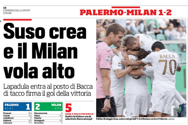Corriere dello Sport: “Suso crea e il Milan vola alto. Tacco velenoso di Lapadula abbatte il Palermo nel suo momento migliore”